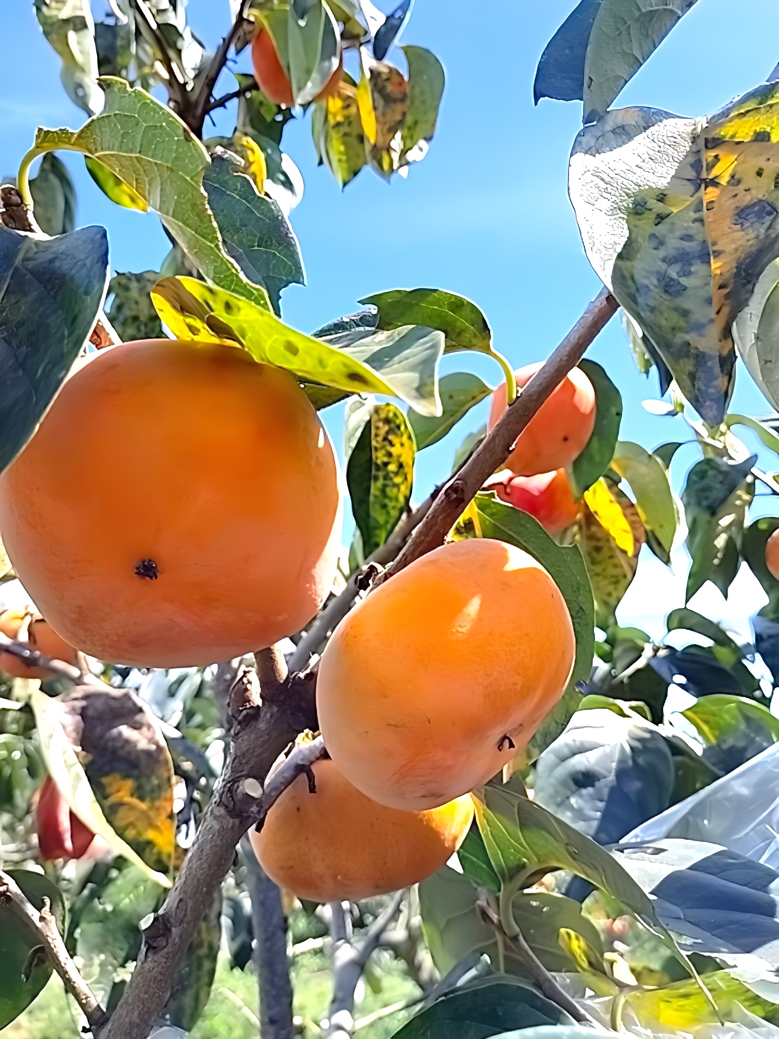 たくさんの虫や生き物たちが暮らしている畑で、太陽の光をいっぱい浴びてすくすくと育ちました。一つひとつ柿の実を見ながら、できるだけ完熟に近づけて収穫しています。